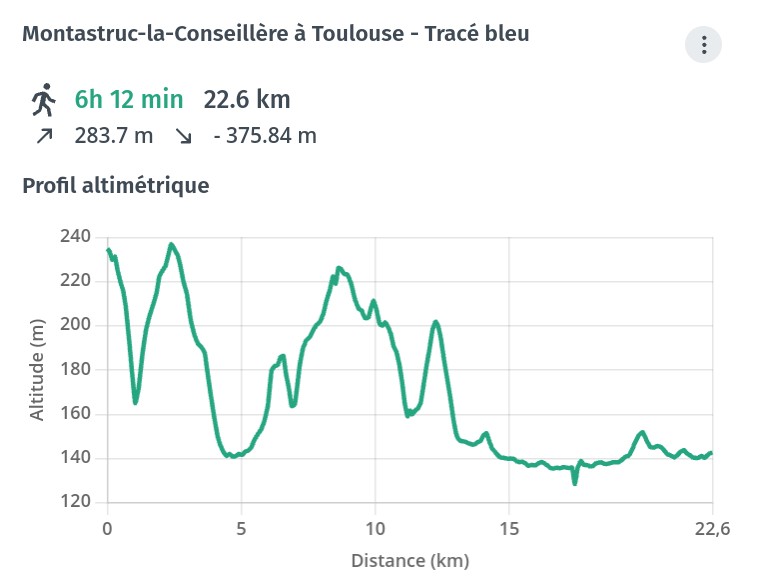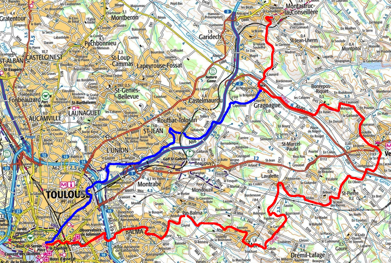 Le tracé en bleu est l'ancien tracé officiel que nous préconisons même si le balisage a disparu. Le tracé en rouge est le nouveau balisage officiel ajoutant quasiment une étape supplémentaire.
